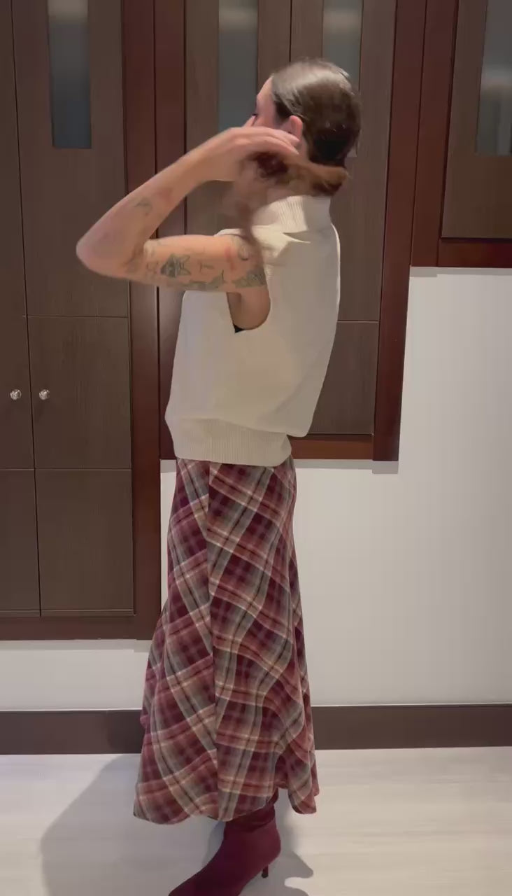 Falda Midi de cuadros en tonos burdeos, beige y camel, ideal para combinar con jerséis, botas, o una blusa para un toque más chic.